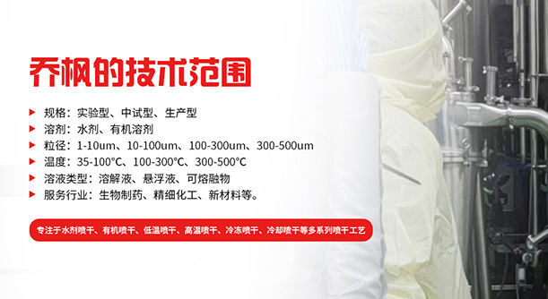 上海喬楓實業有限公司,成立于2012年,是從事噴霧干燥設備的研發設計、生產、銷售(小型噴霧干燥機實驗型噴霧干燥機,35℃低溫噴霧干燥機,有機溶劑噴霧干燥機,低溫閉式循環噴霧干燥機、超細粉末噴霧干燥機噴霧冷凍干燥機、真空噴霧干燥機氣流噴霧干燥機,噴霧造粒干燥機,離心噴霧干燥機,沸騰制粒機等)和售后于一體的綜合性公司,本公司現成為一家致力于為生物制藥、精細化工、新能源、陶瓷造粒及食品工程等領域提供全套解決方案的整線交鑰匙工程企業。